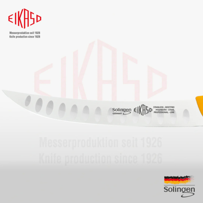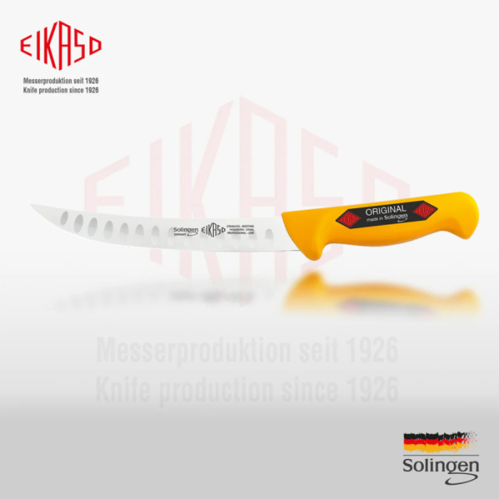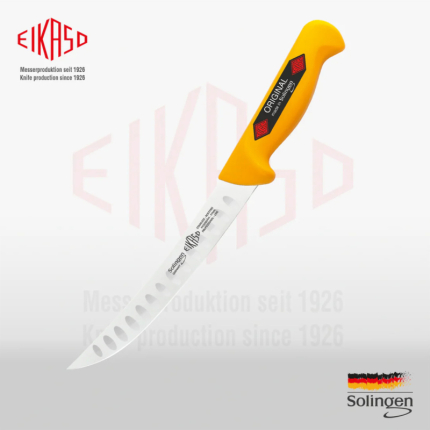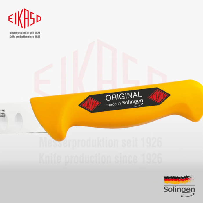 چاقوی قصابی حرفهای Eikaso مدل اولوقدار | برند زولینگن (SolingenGermany) | ساخت آلمان | تیغه فولادی ضدزنگ ۱۸ سانتیمتری | طول کلی ۳۱ سانتیمتر | رنگ زرد | طراحی ارگونومیک | مناسب برای قصابی، کشتارگاه و آشپزخانه صنعتی