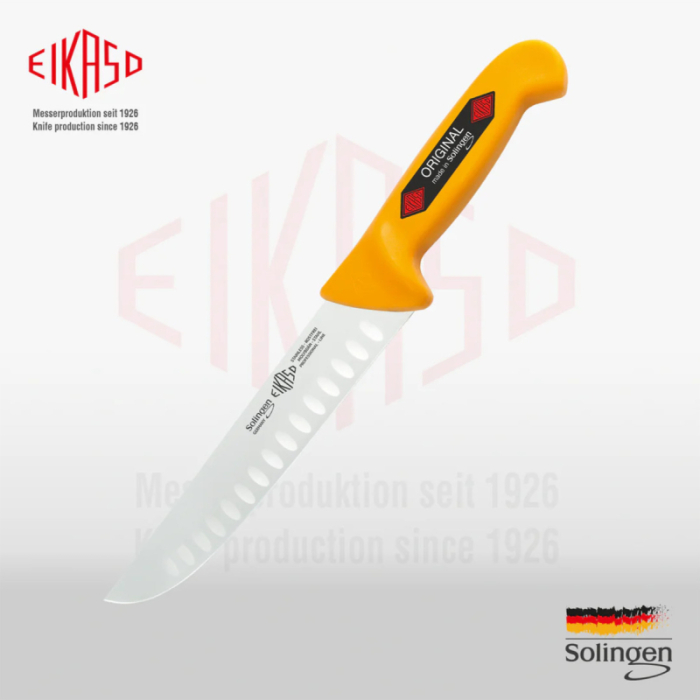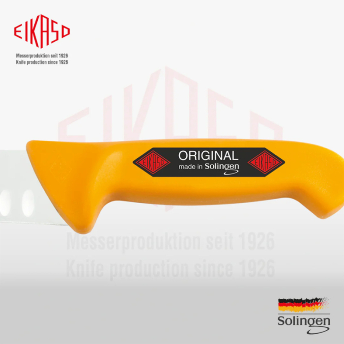 چاقوی قصابی اولوقدار حرفهای Eikaso | برند زولینگن (SolingenGermany) | ساخت آلمان | تیغه فولادی ضدزنگ ۲۱ سانتیمتری | طول کلی ۳۶ سانتیمتر | رنگ زرد | طراحی ارگونومیک | مناسب برای قصابی، کشتارگاه و آشپزخانه صنعتی | مناسب برش دقیق گوشت