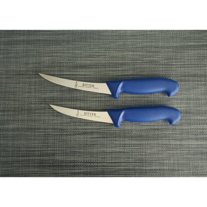 ست چاقوی چربیگیری حرفهای Ritter | برند زولینگن (Solingen) | ساخت آلمان | شامل دو چاقو با تیغه فولادی ضدزنگ ۱۳ و ۱۵ سانتیمتری | رنگ آبی | طراحی ارگونومیک | مناسب برای قصابی، کشتارگاه و آشپزخانه صنعتی | مناسب برای جدا کردن چربی گوشت