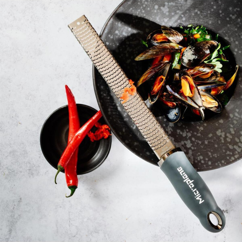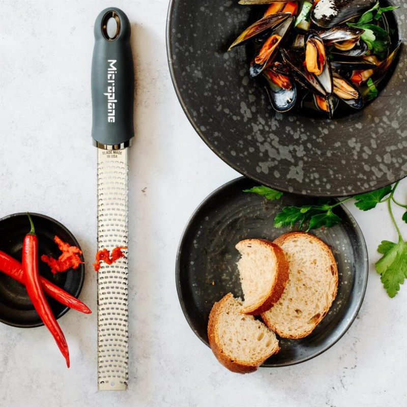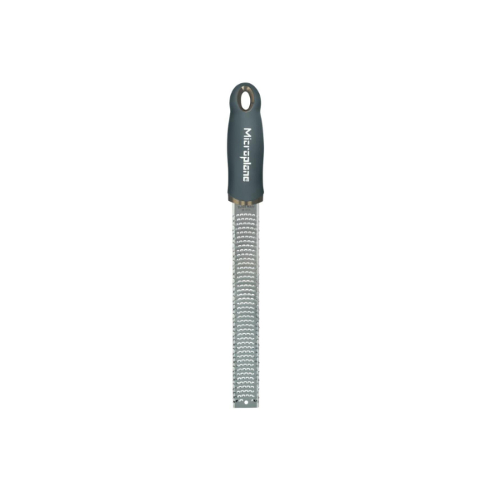 رنده پوستگیر کلاسیک پریمیوم میکروپلن Microplane مدل 46743e | رنگ خاکستری تیره | تیغه فوقتیز از فولاد ضدزنگ با فناوری برش نوری | مناسب برای پوستگیری مرکبات، پنیر سخت، شکلات، زنجبیل، سیر، جوز هندی و خشکبار | طراحی ارگونومیک با دسته نرم و خوشدست | قابل شستوشو در ماشین ظرفشویی