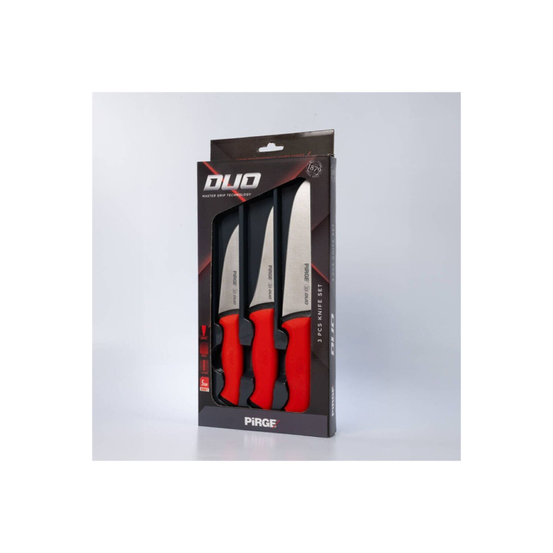 ست چاقوی قصابی حرفهای Pirge مدل Duo | شامل ۳ عدد چاقوی مخصوص سلاخی، سَیْر کردن و برش | تیغه فولادی ضدزنگ با آلیاژ مولیبدن و وانادیوم | ساخت ایران | مناسب برای قصابان، سرآشپزها و قربانی کردن دام | دسته ارگونومیک با فناوری ضد لغزش | مقاوم در برابر زنگزدگی با فرآیند حرارتی انجمادی | طراحی حرفهای برند Pirge برای استفاده در محیطهای صنعتی و خانگی