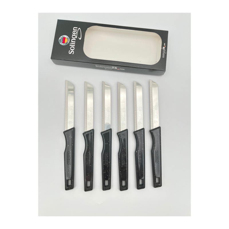 ست ۶ عددی چاقوی میوه خوری Solingen مدل DKS | تیغه فولادی ضدزنگ با دوام بالا | دستههای مشکی با طراحی براق و شیک | مناسب برای استفاده روزمره و پذیرایی | قابل استفاده برای برش میوه، سبزیجات و خوراکیهای سبک | ساخت آلمان | قابل شستوشو دستی (غیر قابل شستوشو در ماشین ظرفشویی)