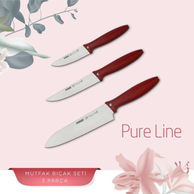 ست چاقوی آشپزخانه Pirge مدل Pure Line | شامل ۳ عدد چاقوی کاربردی با تیغه‌ فولادی ضدزنگ | تیغه‌ ۹، ۱۲ و ۱۹ سانتی‌متری | مناسب برای پوست‌گیری، برش و خرد کردن انواع مواد غذایی | طراحی ارگونومیک با دسته‌ PP تزریقی | تیغه‌ تیز شده و پولیش‌ شده با دوام بالا | مناسب برای استفاده‌ روزمره در آشپزخانه