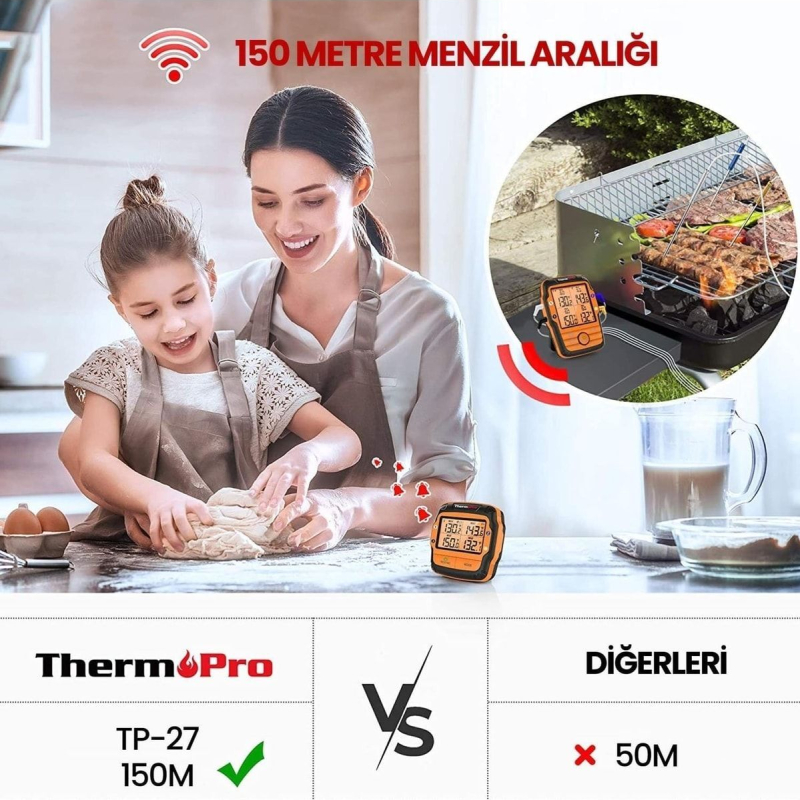 ترمومتر حرفهای ThermoPro TP27C | بیسیم با برد 150 متر | مجهز به آلارم و نور پسزمینه | دارای 4 پروب استیل ضد زنگ | نمایش سریع و دقیق دما | مناسب برای فر و پخت انواع گوشت و غذا